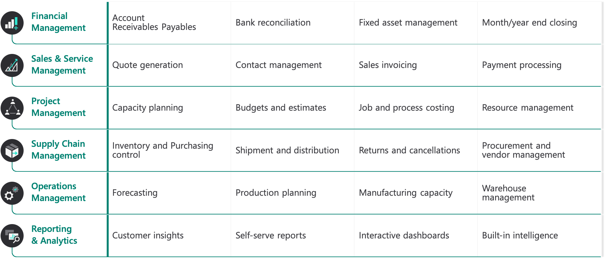 As a single all-in-one platform solution, it makes managing financials, sales, service, and operations easier and faster at a lower cost of ownership, compared to traditional ERP solutions and is tailored to specifically meet the needs of SMEs and a wide range of areas as shown below: